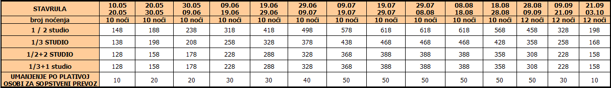 Cene iz tabele predstavljaju cenu paket aranžmana (smeštaj + prevoz) po osobi.