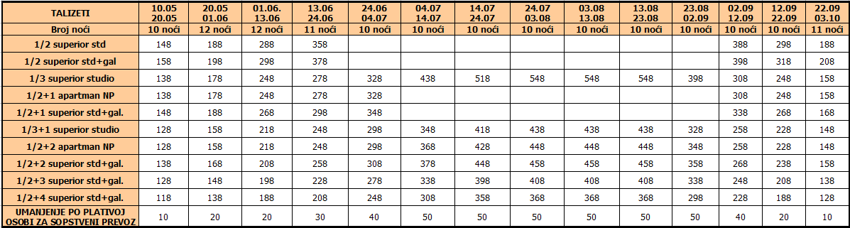 Cene iz tabele predstavljaju cenu paket aranžmana (smeštaj + prevoz) po osobi.