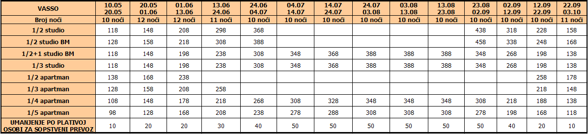 Cene iz tabele predstavljaju cenu paket aranžmana (smeštaj + prevoz) po osobi.