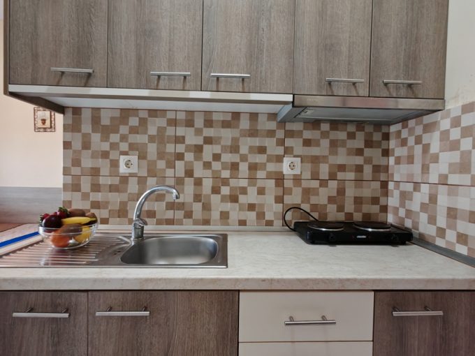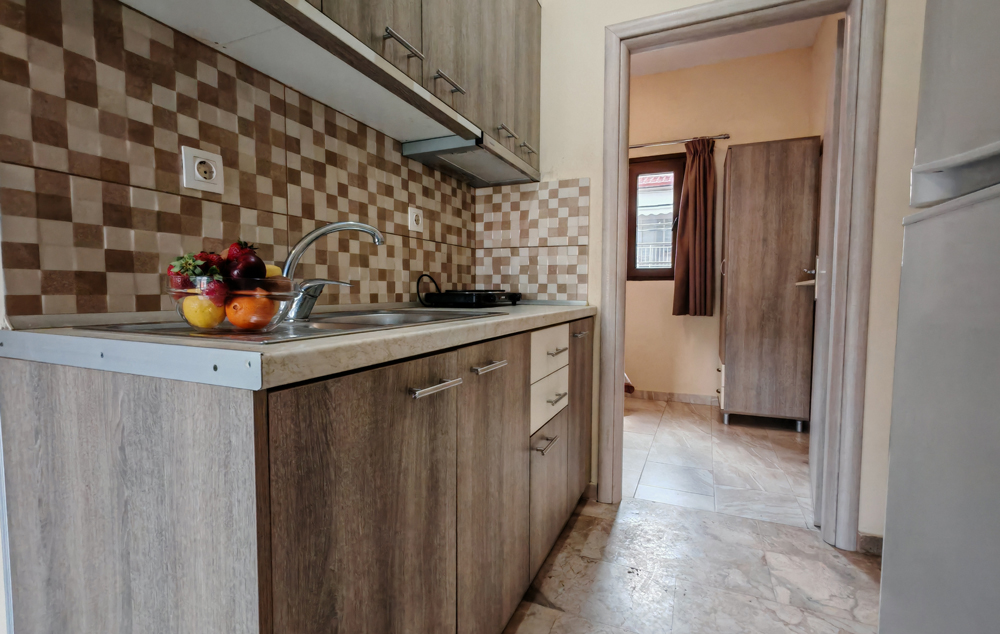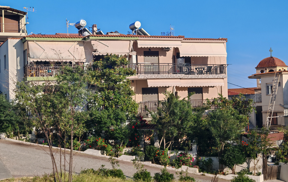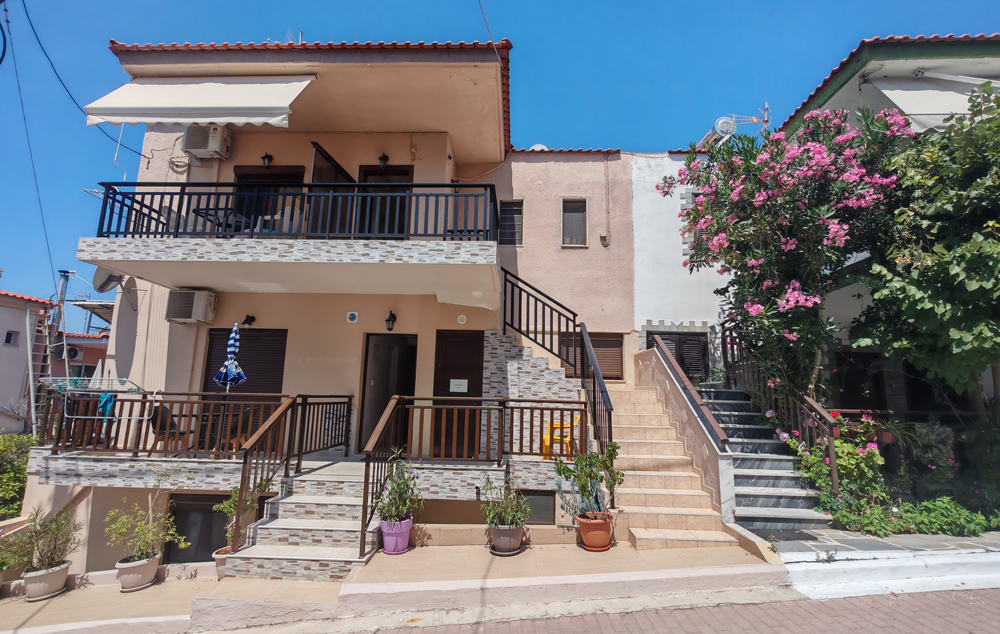 Nalazi se na oko 140m od mora, na uzvišenju pored crkve. Osim gradske plaže, u blizini je i jedna manja uvala sa stenama i peskom. Na drugom spratu nalaze se renovirani studiji i apartmani. Studio za 2-3 osobe ima pogled na celo mesto i u daljini more, dok trokrevetni studio i apartman gledaju ka bašti. Kuća ima signal za besplatan bežični internet, a smeštajne jedinice imaju TV i klima uređaj čije se korišćenje doplaćuje.