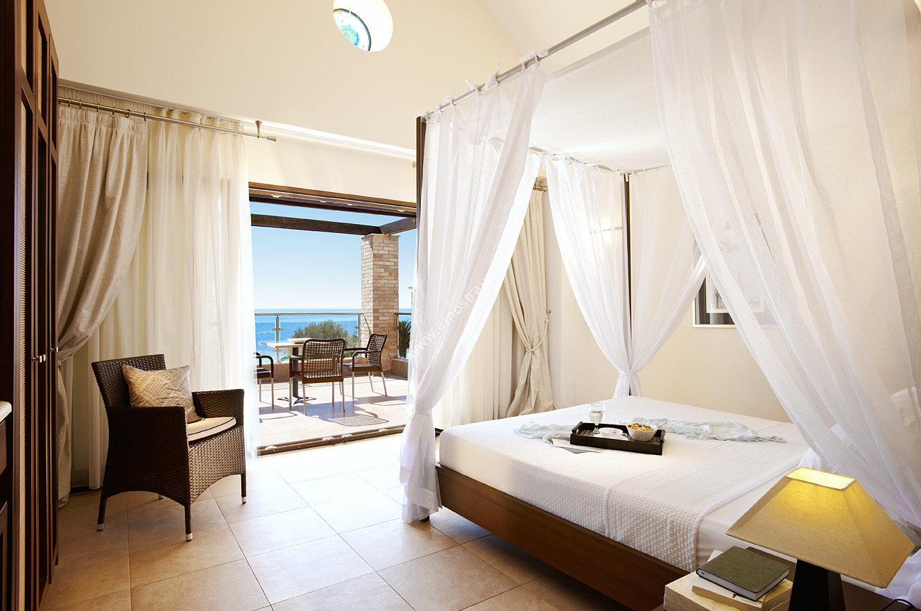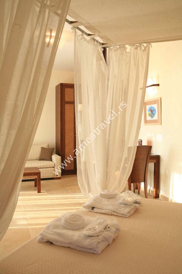 Junior suite, oko 45m2, sastoje se iz spavace sobe i dnevne sa još dve sobe, sa pogledom na more bocno, baštu ili bazen, namenjene su za 2-4 osobe.