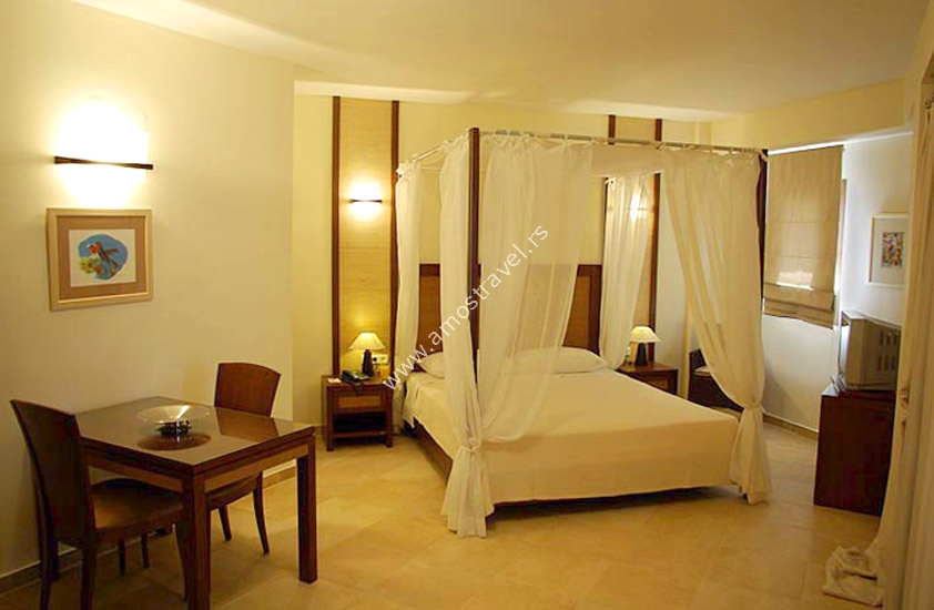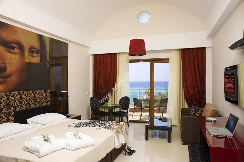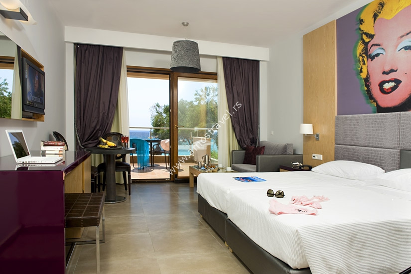 Deluxe sobe, oko 35m2, imaju dva standardna ležaja i sofu, sa pogledom na more bocno ili direktno ili na bazen, namenjene za 2-3 osobe.