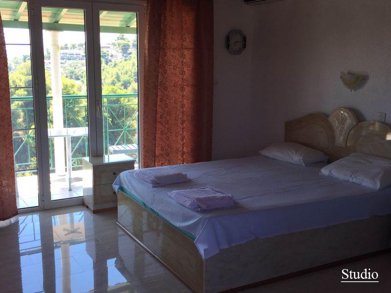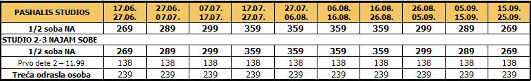 Svaki studio ima klima uređaj,TV, tuš/wc i čajnu kuhinju u skoplu sobe i balkon. U studio se mogu smestiti 2 odrasle osobe i dete ili 3 odrasle osobe (treći ležaj je pomoćni)