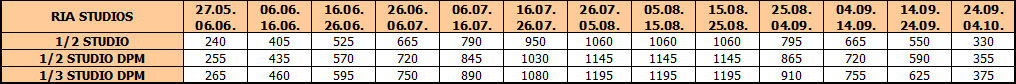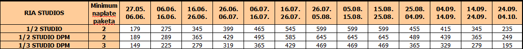 Cene u tabeli su izražene na bazi najma po studiju/apartmanu za 10 noćenja.
