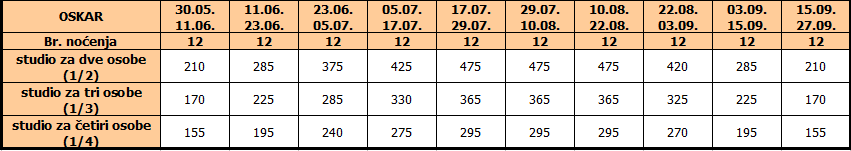 • Ukoliko dete do 12 godina koristi vlastiti ležaj, plaća cenu iz tabele umanjenu za 20€