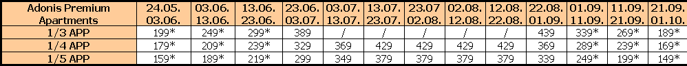 Za sopstveni prevoz cena aranžmana se umanjuje za 30€ po osobi, a 20€ za smene označene ZVEZDICOM (*)