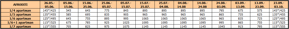 Cene su izražene u eurima po studiju/apartmanu na bazi najma za 10 noćenja