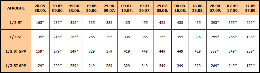 Cene označene zvezdicom* iskazane su po osobi i obuhvataju smeštaj i prevoz. U slučaju sopstvenog prevoza u smenama sa * cena se umanjuje za 20 eur po osobi od ukupne vrednosti aranžmana.
