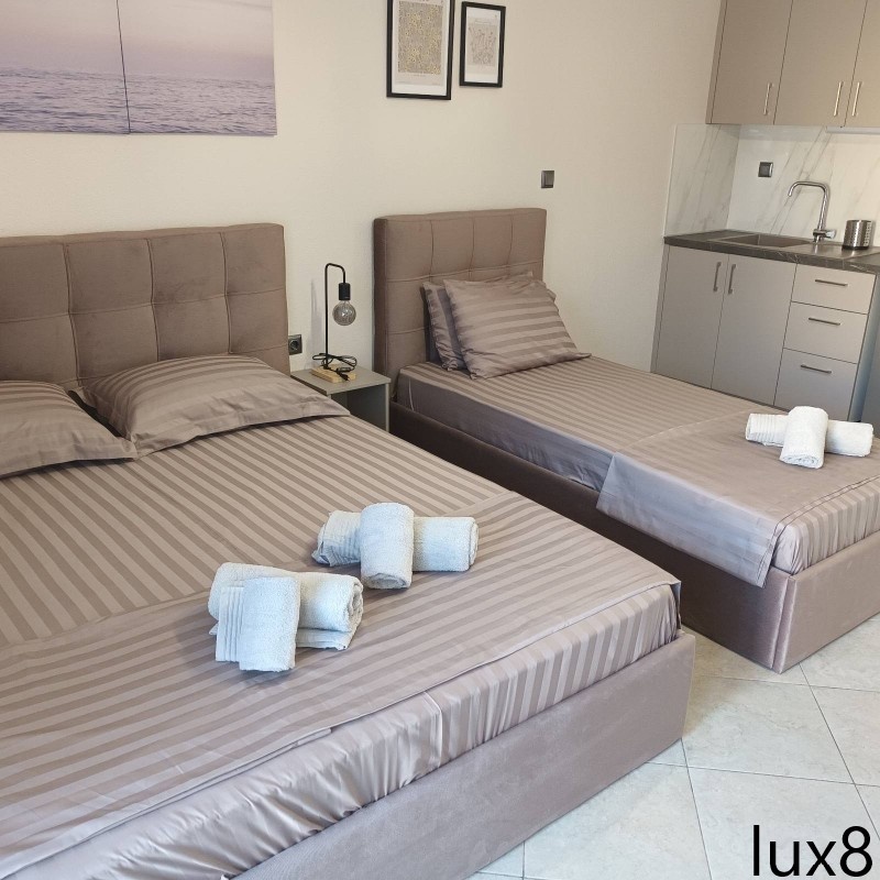 1/4 studio lux – u jednoj prostoriji čajna kuhinja, jedan bračni ležaj dva obična ležaja (200*90cm) i (190*80cm).