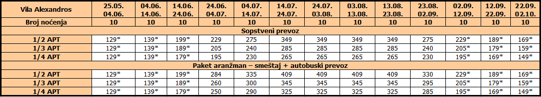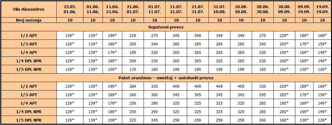 Cene iz tabele su izražene u evrima po osobi na bazi 10 noćenja