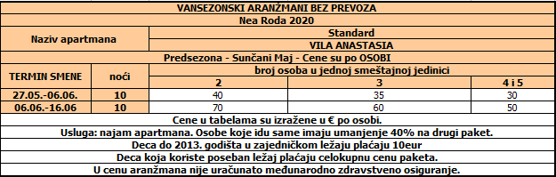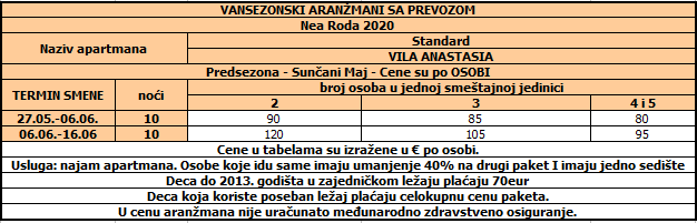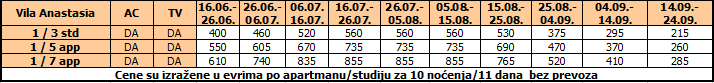 Cene su izražene u evrima po apartmanu/studiju za 10 noćenja bez prevoza