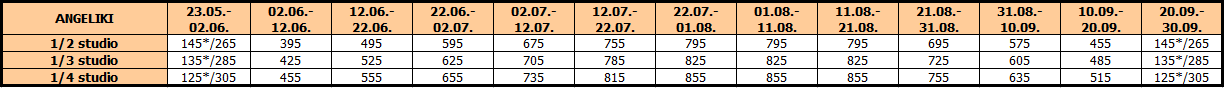 Cene su izražene u eurima po studiju/apartmanu na bazi najma za 10 noćenja