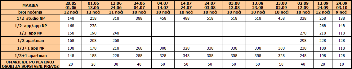 Cene iz tabele predstavljaju cenu paket aranžmana (smeštaj + prevoz) po osobi.