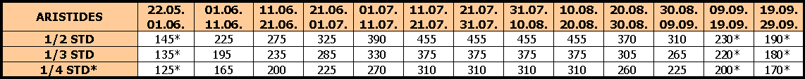 Jedna osoba u 1/2 STD: Doplata za 1/1 studio/ apartman – 70% od cene paket aranžmana; (osim kod smena označenih zvezdicom – u kojima je doplata 100%);