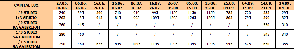 Cene u tabeli su izražene na bazi najma po studiju/apartmanu za 10 noćenja.