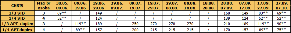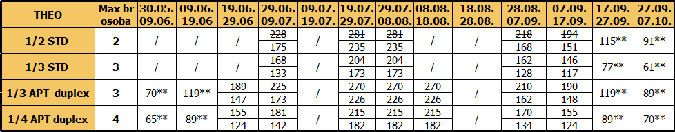 – Doplata za 1/1: dve cene iz tabele sa umanjenjem za jedan prevoz od 30€ (osim u terminima obeleženim **)