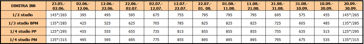 Cene su izražene u eurima po studiju/apartmanu na bazi najma za 10 noćenja