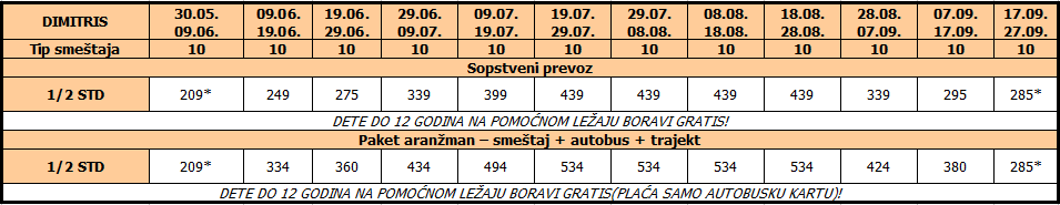– *Dete od 2 do 12 godina u pratnji dve odrasle punoplative osobe U VILI DIMITRIS u 1/2 studiju boravi gratis, odnosno plaća samo cenu autobuske karte (ukoliko putuje autobusom);