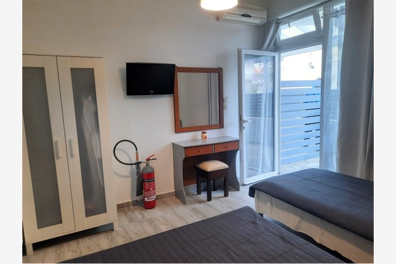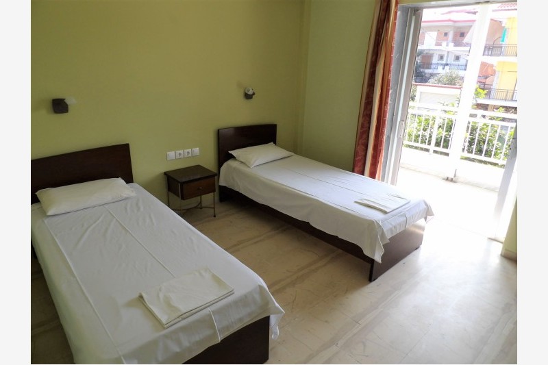 Vila Dimitris se nalazi u novom delu Nei Porija, na oko 150 metara udaljenosti od plaže. U ponudi ovog objekta su dvokrevetni i trokrevetni studiji kao i četvorokrevetni i petokrevetni dupleks apartmani. Studiji su smešteni u prizemlji i na poslednjem a dupleks apartmani na prvom i drugom spratu. Svaka smeštajna jedinica poseduje osnovno opremljenu kuhinju, kupatilo, terasu, TV i klima uređaj čije se korišćenje dodatno naplaćuje. Tokom boravka gosti sami vode računa o higijeni apartmana dok je promena posteljine na polovini boravka. U objektu postoji i mogućnost korišćenja WiFi interneta.