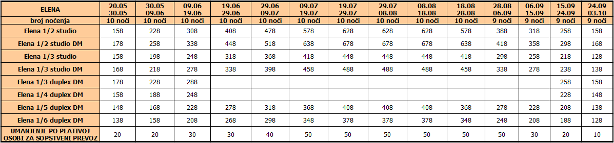 Cene iz tabele predstavljaju cenu paket aranžmana (smeštaj + prevoz) po osobi.