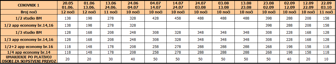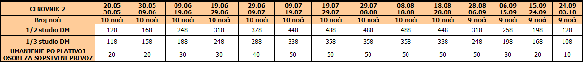Cene iz tabele predstavljaju cenu paket aranžmana (smeštaj + prevoz) po osobi.