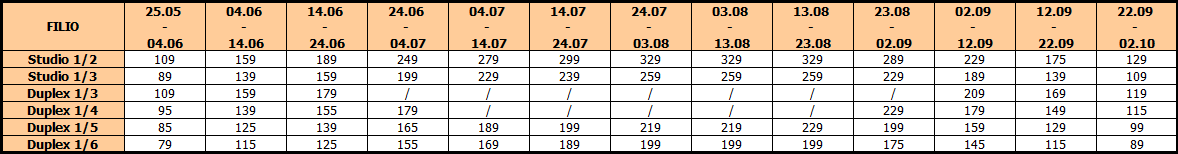 1/4 duplex – odvojena kuhinja, u jednoj sobi su dva standardna ležaja, u drugoj sobi jedan grčki francuski ležaj ili u jednoj sobi su grčko-francuski ležaj, u drugoj sobi ili jedan grčki francuski ili jedan bračni ležaj ili dva standardna ležaja.