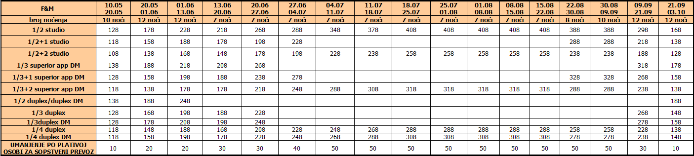 Cene iz tabele predstavljaju cenu paket aranžmana (smeštaj + prevoz) po osobi.