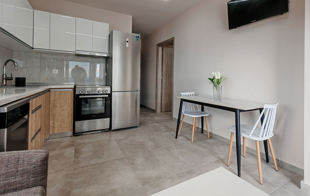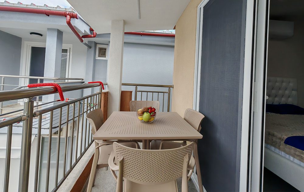 Petokrevetni superior apartman sa direktnim pogledom na more nalazi se na drugom spratu u kući F&M. Izdvaja se po opremljenosti kuhinje koja ima šporet sa 4 ringle i rernom kao i mašinu za pranje sudova i visokim frižiderom i zamrzivačem. Izdvaja se po opremljenosti kupatila sa tuš kabinom i mašinom za veš. U dnevnoj sobi se nalazi dvosed koji se pretvara u krevet na rasklapanje (širine 120 cm). U spavaćoj sobi se nalazi king size francuski krevet (širine 180 cm) i klasičan ležaj za jednu osobu. I dnevna soba i spavaća imaju svoju terasu. Pored svega navedenog izdvaja se po veoma izdašnom garderobnom prostoru gde se bez problema može raspakovati petočlana porodica jer za razliku od ostalih smeštaja ima američki plakar sa tri klizna dela kao i još jedan dvokrilni orman. Svaka soba ima TV i klima uređaj nove tehnologije Midea Breezless koji se može podesiti da klima radi bez stvaranja neprijatnog hladnog vazduha.