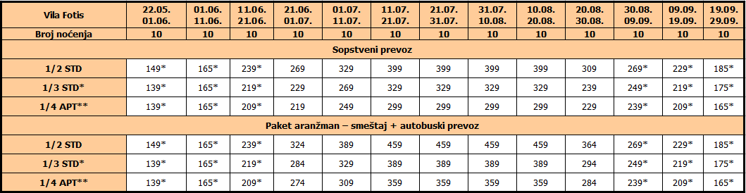 Cene iz tabele su izražene u evrima po osobi na bazi 10 noćenja
