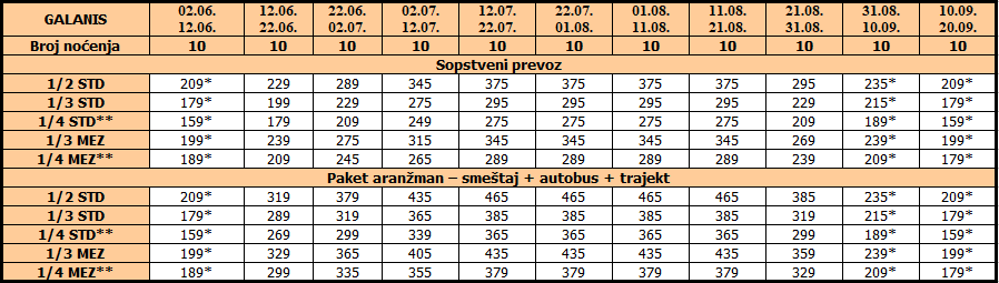Termini označeni * čine paket aranžman (smeštaj + autobuski prevoz + trajekt) i nemaju umanjenje za sopstveni prevoz