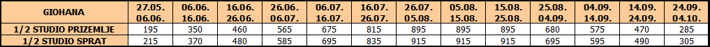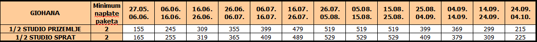 Cene u tabeli su izražene na bazi najma po studiju/apartmanu za 10 noćenja.