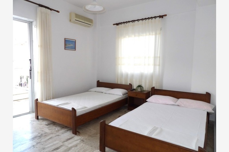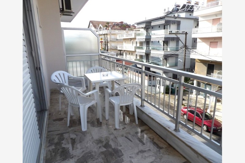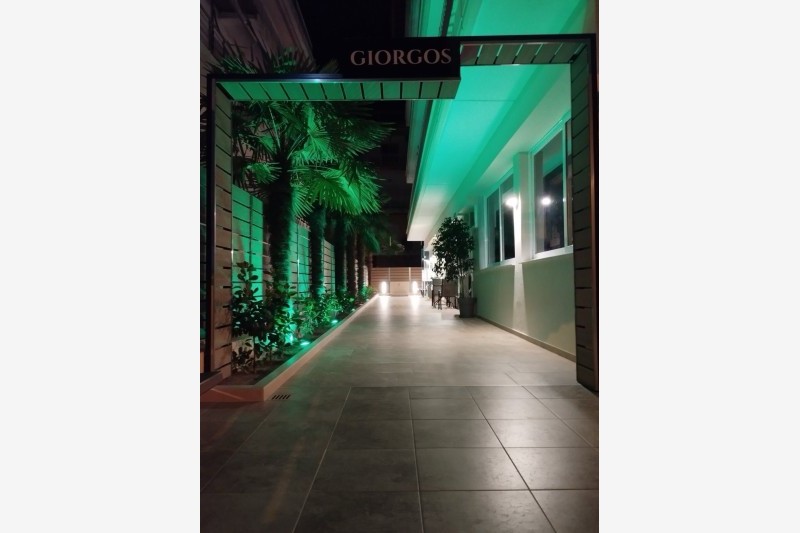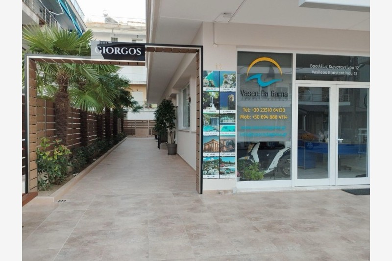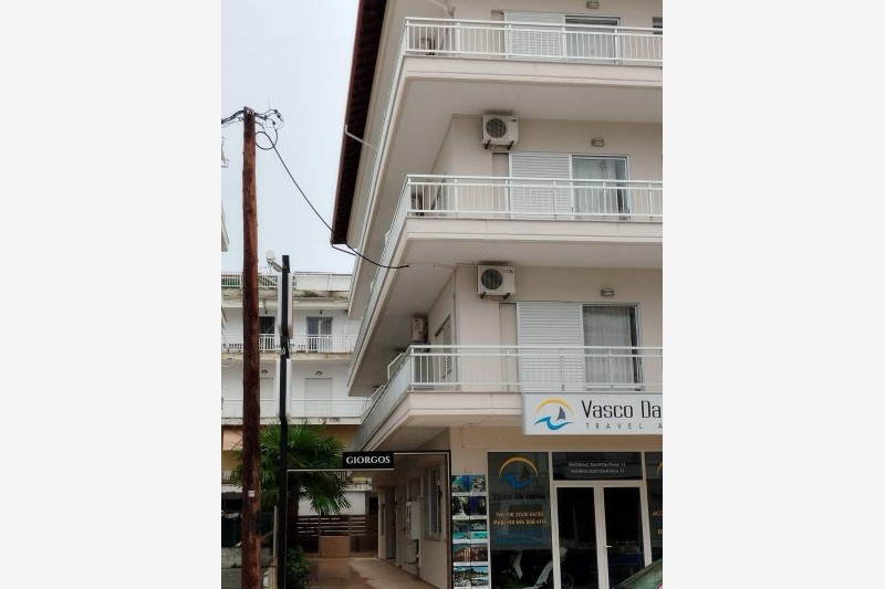 Vila Giorgios se nalazi u novom delu Paralije, u blizini centra i na oko 140 metara udaljenosti od plaže. U ponudi ovog objekta su dvokrevetni I trokrevetni studiji. Objekat poseduje recepciju, lift i toalet za poslednji dan boravka. Sve smeštajne jedinice imaju osnovno opremljenu kuhinju, kupatilo, terasu, TV i klima uređaj čije se korišćenje dodatno naplaćuje. Promena posteljine je jedanput u toku boravka a u objektu postoji i mogućnost korišćenja WiFi interneta.
