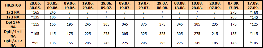 Polazak iz Niša-umanjenje 10 € (za odrasle) po osobi na cenu iz tabele, 20€ ( za decu od 2 do 12 godina) po osobi na cenu iz tabele