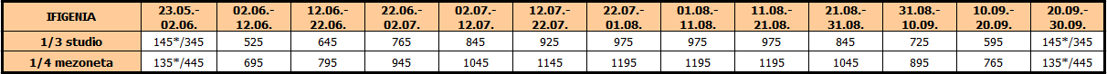 -Kod prodaje duple smene – prva smena gde je cena sa zvezdicom (*) i narednog termina, putnik plaća paket po osobi plus najam apartmana u sledećoj smeni. Isto važi i za poslednju smenu sa zvezdicom (*).