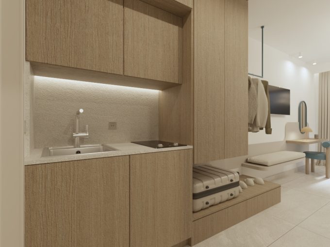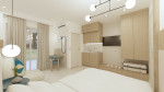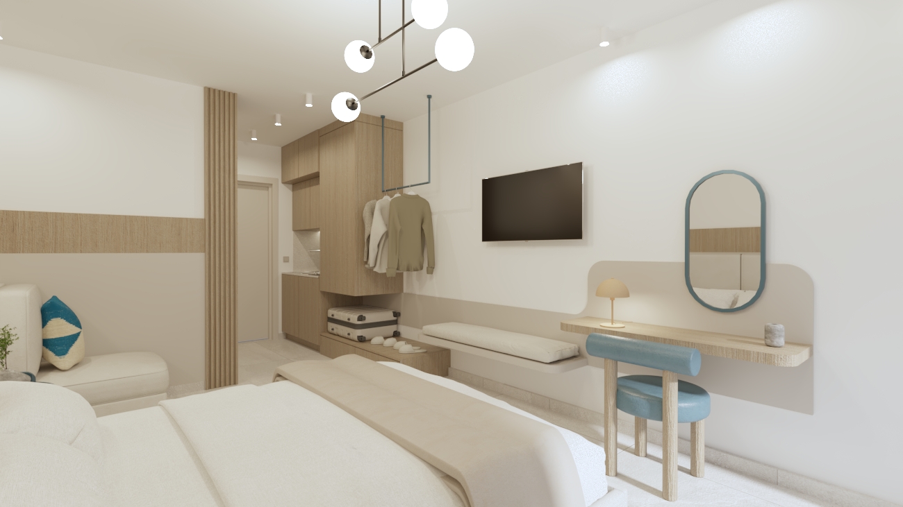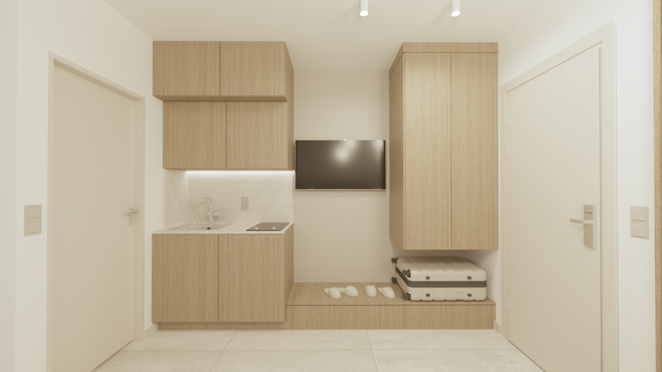 Studio 1/2+1: Studiji se sastoje od francuskog ležaja i fotelje na razvlačenje, TV/KAT, klima uređaj (korišćenje je besplatno), noćni stočić, orman, kao i kuhinjski deo koji je u potpunosti opremljen sa posuđem, rešo sa dve ringle, frižider, aspirator. Kupatila imaju tuš/wc. Studiji se nalaze na prvom, drugom i trećem spratu.