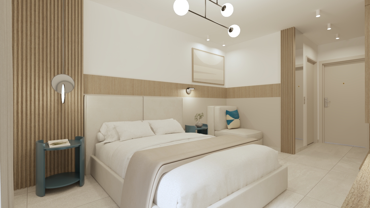 Dvokrevetni studio: Studiji se nalaze na prvom, drugom i trećem spratu i sastoje se od francuskog ležaja dimenzija 200x140cm ili dva singl ležaja, TV/KAT, klima uređaj (korišćenje je besplatno), noćni stočić, orman, kao i kuhinjski deo koji je u potpunosti opremljen sa posuđem, rešo sa dve ringle, frižider, aspirator. Kupatila imaju tuš/wc.
