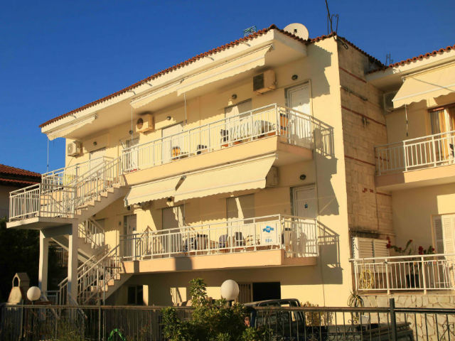 Vila Irida se nalazi na samo 50m od plaže a u samom centru mesta. Ulica u kojoj je vila smeštena, i ako u centru, nije mnogo prometna. Vila nudi smeštaj u četvorokrevetnim i petokrevetnim apartmanima koji se nalaze na prvom spratu. Sve jedinice su opremljene kuhinjom (rešo sa dva grejne ploče), kupatilom sa tuš kadom, SAT TV-om, klima uređajem. Vila poseduje i privatni parking. Idealna za porodice i sve one koji žele komforan smeštaj nadomak peščane plaže a u samom centru Nea Skionija. U neposrednoj blizini kuće se nalazi i istoimeni restoran-picerija gde možete uživati u domaćim i internacionalnim specijalitetima.
