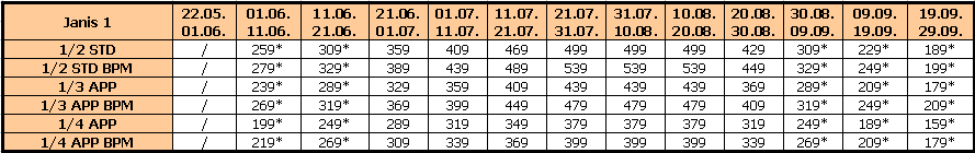 Za sopstveni prevoz cena aranžmana se umanjuje za 30€ po osobi, a 20€ za smene označene ZVEZDICOM (*)