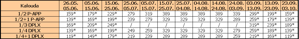 Za sopstveni prevoz cena aranžmana se umanjuje za 30€ po osobi, a 20€ za smene označene ZVEZDICOM (*)