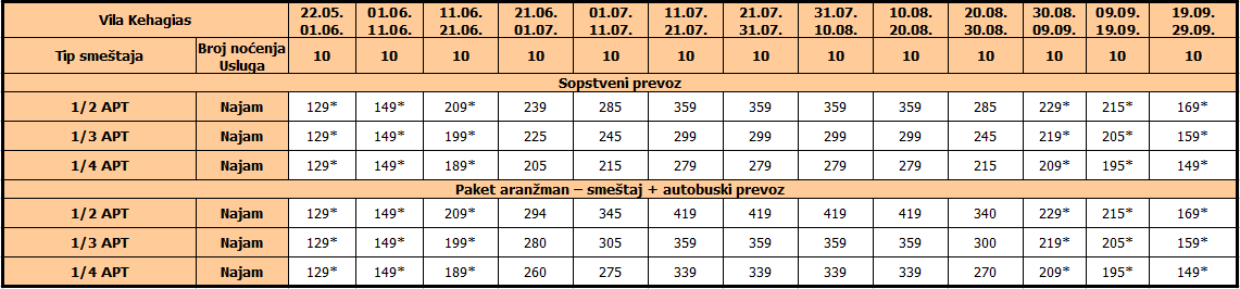 Cene iz tabele su izražene u evrima po osobi na bazi 10 noćenja
