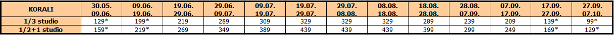 U slučaju spajanja smena na organizovanom prevozu, cena aranžmana za drugu smenu se umanjuje za 40 eur po osobi, osim za smene koje su u tabeli označene zvezdicom (*) gde se u slučaju spajanja smena cena umanjuje 30 € po osobi.