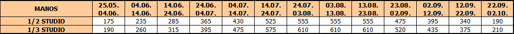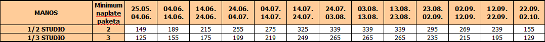 Cene u tabeli su izražene na bazi najma po studiju/apartmanu za 10 noćenja.