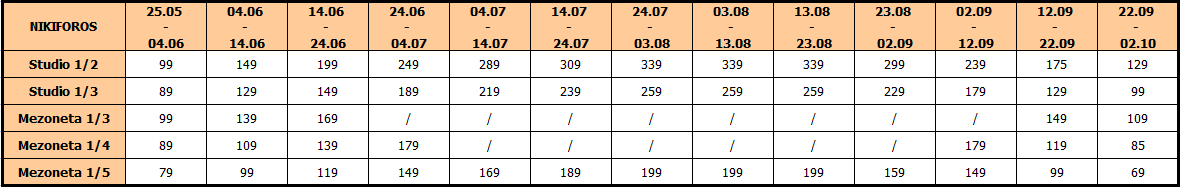 VILA NIKIFOROS – se nalazi na 100 metara od plaže i na oko 400 metara od crkve i samog centra Nei Poria. U blizini su super market, kao i uređeno dečije igralište. Vila Nikiforos u dvoištu poseduje tuš, kao i prostor za odlaganje stvari za prvi i poslednji dan boravka.