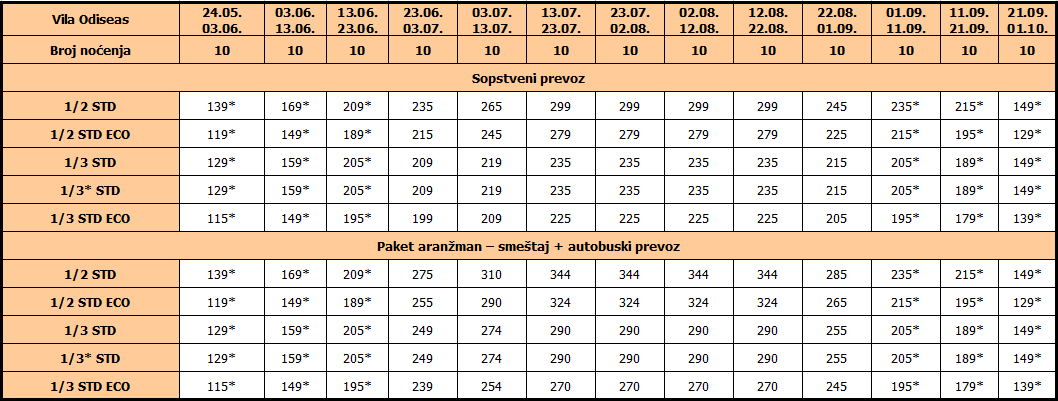 Cene iz tabele su izražene u evrima po osobi na bazi 10 noćenja