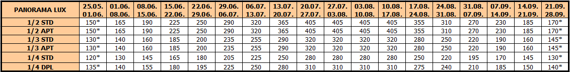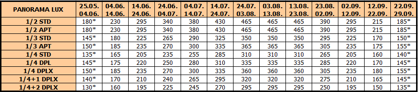 Panorama lux: Raspolaže studijima, apartmanima i dupleks apartmanima, namenjenim za smeštaj od dve do šest osoba, koji se nalaze na visokom prizemlju, prvom ili drugom spratu. Sve smeštajne jedinice su renovirane za sezonu 2025. i većina ima pogled na more.