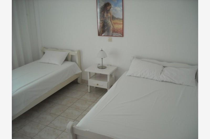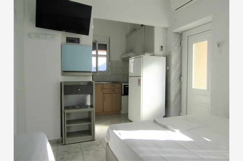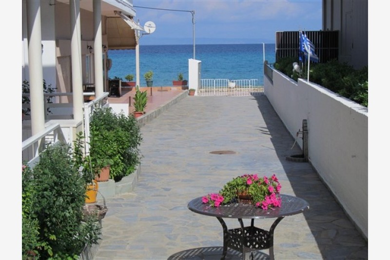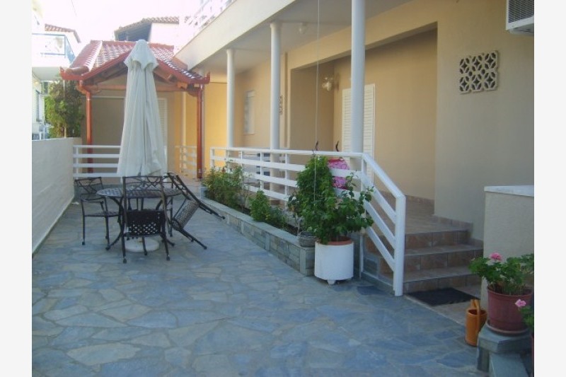 Vila se nalazi na oko 15m od plaže, odmah iza vile Janis Beach u centralnom delu Polihrona. Dvorište vile Polistilo Spiti izlazi na šetalište i plažu. U ponudi su dvokrevetni i trokrevetni studiji koji se nalaze u prizemlju vile. Svaki studio poseduje TV i klima uređaj čije je korišćenje uračunato u cenu najma apartmana, a postoji i mogućnost korišćenja WiFi internet. Tokom boravka gosti vile sami održavaju higijenu u apartmanima, dok se posteljina menja jedanput u toku boravka.