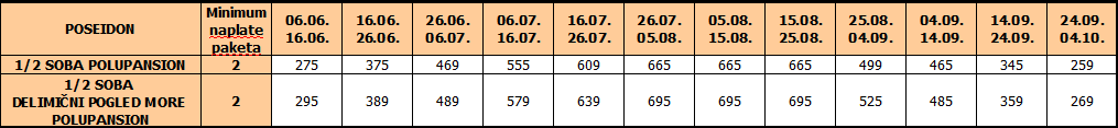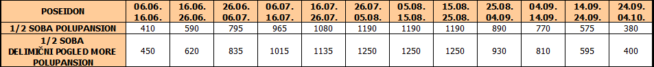 Cene u tabeli su izražene na bazi polupansiona po sobi za 10 noćenja.