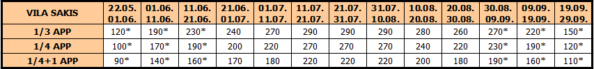 Cene označene zvezdicom* iskazane su po osobi i obuhvataju smeštaj i prevoz. U slučaju sopstvenog prevoza u smenama sa * cena se umanjuje za 20 eur po osobi od ukupne vrednosti aranžmana.