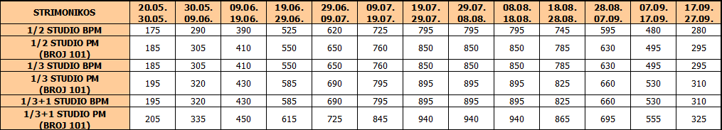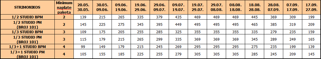 Cene u tabeli su izražene na bazi najma po studiju/apartmanu za 10 noćenja.