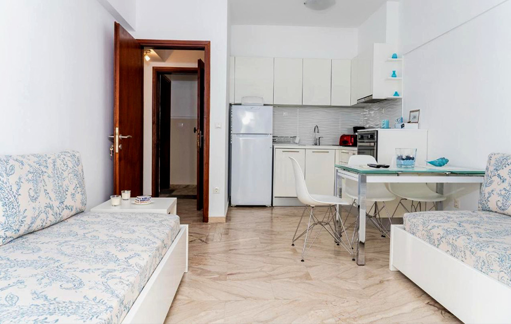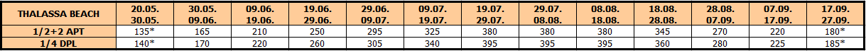 Odlična vila Thalassa Beach, sastoji se od apartmana na prvom spratu i svi su sa bočnim pogledom na more. Pored izuzetnog kvaliteta i opremljenosti ovih apartmana, ističe ih i odlična lokacija, pored same plaže (oko 40 metara) i u strogom centru letovališta, na glavnom šetalištu. Četvorokrevetni apartman sadrži dobro opremljenu kuhinju sa trpezarijskim stolom (veliki frižider sa zamrzivačem, šporet sa rernom, mašina za pranje sudova…), a u nastavku se nalazi deo sa dnevnim boravkom gde se nalaze sofe – dva ležaja nešto manjih dimenzija od standardnih, na kojima mogu spavati deca do 12 godina (ili do 15 na upit), spavaću sobu sa dva standardna ležaja i plafonskim ventilatorom, kupatilo sa kadom i veliku natkrivene terasu sa garniturom za sedenje. Veličina apartmana je cca 35 kvm + terasa. Opremljen je sa wi – fi Internetom, TV-om i mrežom za komarce, klima uredjajem (uključeni u cenu) u dnevnom boravku, dok spavaća soba ima plafonski ventilator. Četvorokrevetni dupleks apartman sadrži dobro opremljenu kuhinju sa trpezarijskim stolom i sofom (veliki frižider sa zamrzivačem, šporet sa rernom…), dve spavaće sobe sa po dva standardna ležaja, kupatila sa kadom i velike natkrivene dve terase sa garniturom za sedenje. Veličina apartmana je cca 40 kvm + terasa. Opremljen je sa wi – fi Internetom, TV-om i mrežom za komarce, dva klima uredjaja (uključeni u cenu), jedan u dnevnom boravku i drugi u spavacoj sobi, dok druga spavaća soba ima plafonski ventilator. Vila Thallasa Beach je A kategorije, ima peškire, a parkiranje je moguće na ulici pored vile.